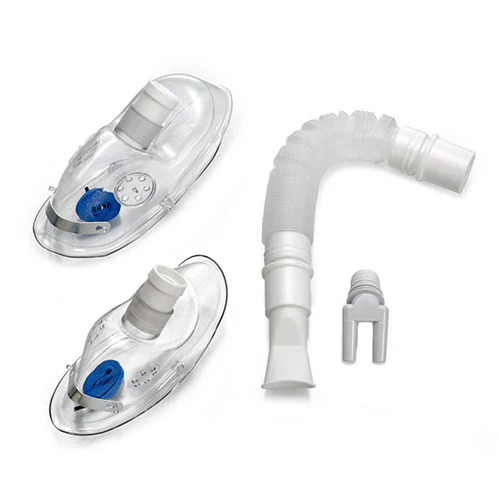 - Kit completo de accesorios (mascaras adulto y niño, tubos de conexión extensibles, adaptadores bucales, membranas, juntas de goma.